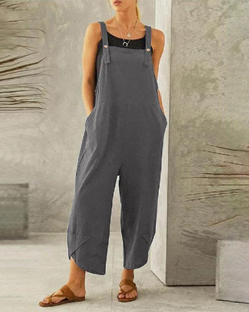 Button Pocket Playsuit Romper Women Strap Long Solid Casual Jumpsuits