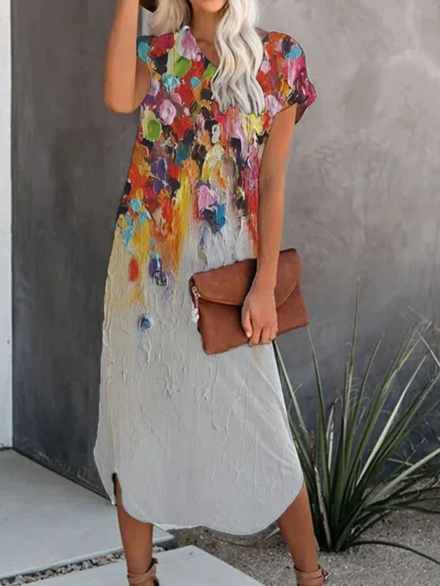 Casual Oil Painting Print Round Neck Short Sleeve Maxi Dress